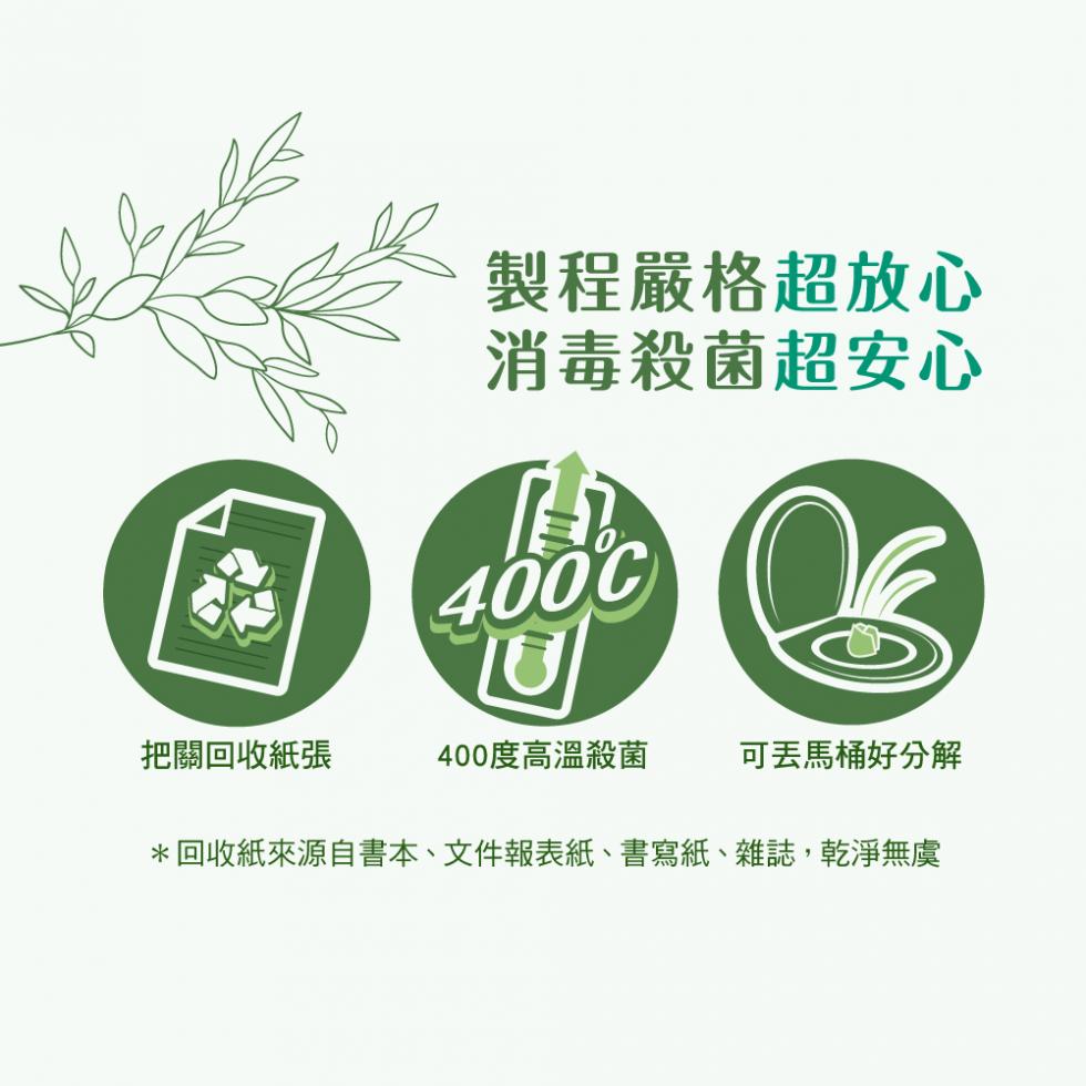 ◆ 商品介紹: 100% 再生紙漿,資源不浪費 風力發電潔淨能源生產 400 度高溫殺菌,紙張潔淨不漂白 易分散不堵塞馬桶 取得環保標章、FSC 森林驗證與碳足跡三重驗證 ◆ 商品規格: 規格:100抽 X 12包 X 6串/箱 呎吋:200mm X180mm